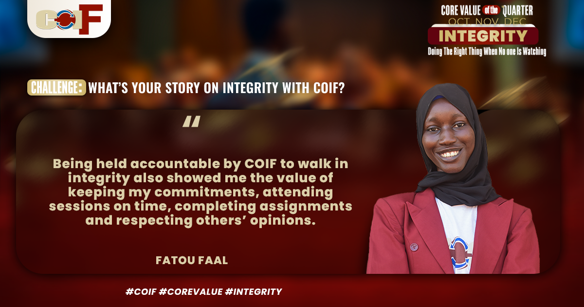 In my experience, integrity at COIF is not just a word; it is something I have seen in action during my three years mentorship journey. I have seen first hand mentors and leaders consistently leading by example. They don't only guide us with words, they also model honesty, responsibility, and respect.